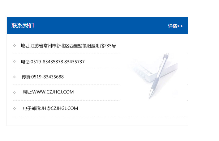 地址:常州市新北區友邦商務大廈1幢16、17層  電話:0519-85101652  傳真:0519-85112595  郵編:213022  網址:www.cz-jiayue_cn.dmkqzj.com  郵箱:xiajifengaa@163.com